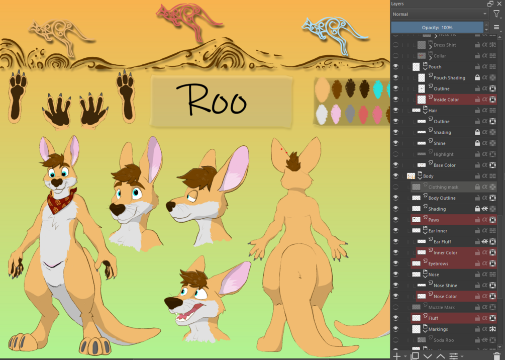 Kangaroo reference sheet, full layers provided. Multiple clothing options that can layer on top of each other.